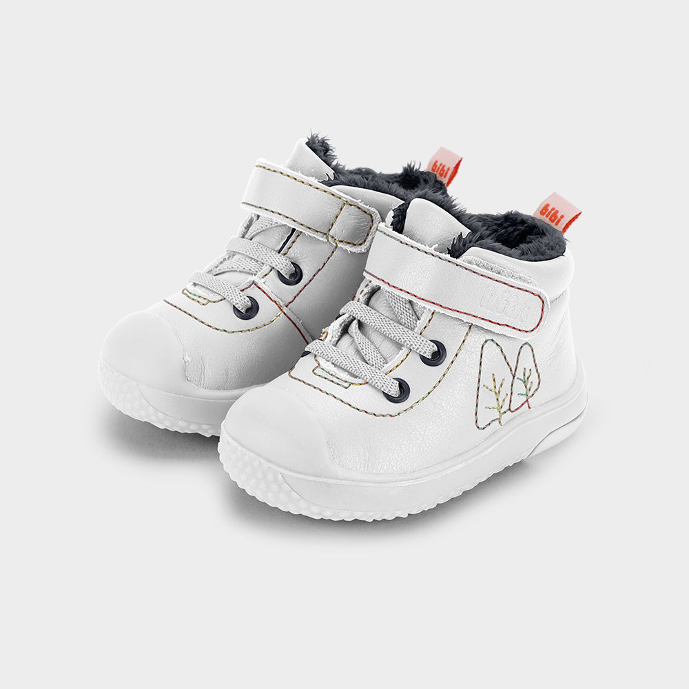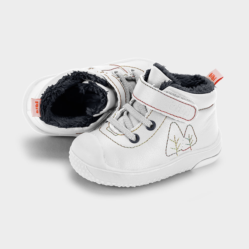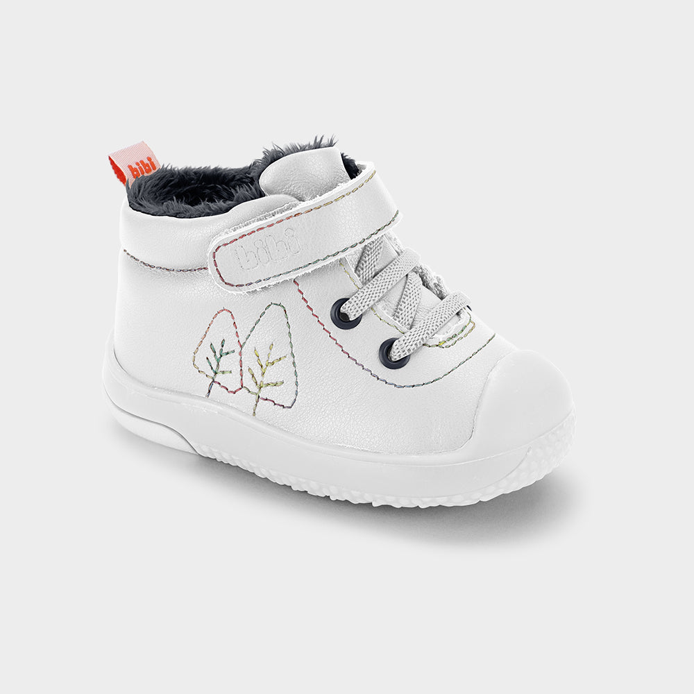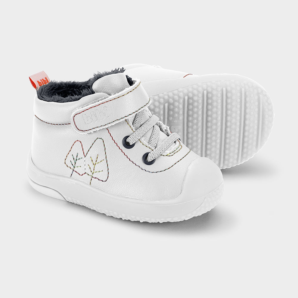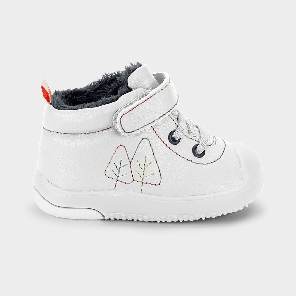 White boot-style model, designed to provide maximum freedom, comfort, and protection during the crawling stage. Made of leather, with embroidery detail on the side, fur lining, and Velcro closure for an easier fit and practicality. Flexible sole facilitates movement, and the reinforced toe cap protects the toes while providing greater resistance. Features a “Fisioflex” leather insole that is soft and feels like walking barefoot.